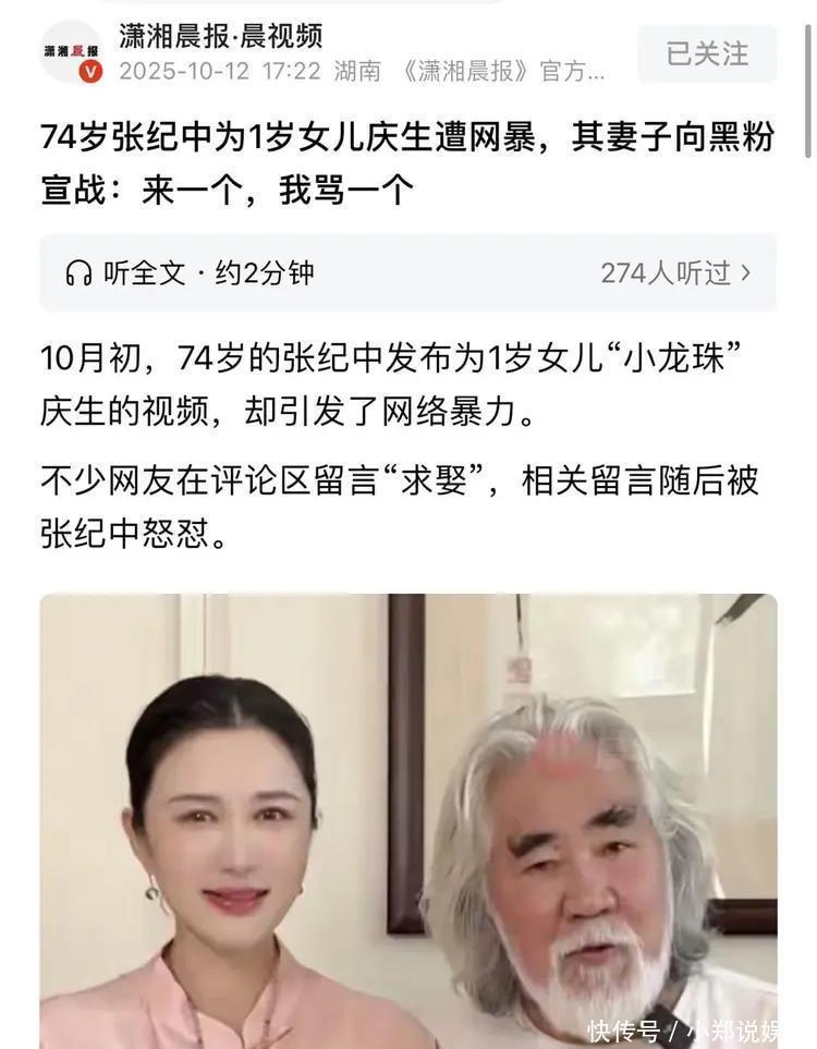 据媒体报道,10月初,74岁的张纪中发布为1岁女儿“小龙珠”庆生的视频,却引发了网络暴力。