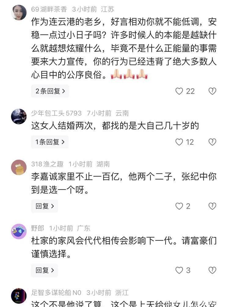 杜星霖表示,这么多年遭受网络暴力,她都忍了,毕竟有些人生活不如意,来网上发泄发泄,也算是“积德行善”了。但要是谁敢动她的孩子,那可就另当别论了。不过,网友们的反问也颇为犀利:“你能嫁大30多岁的张纪中,凭啥不让女儿选年纪大的?这双标味儿也太冲了。对于这件事,有网友评论:“作为连云港的老乡,好言相劝你就不能低调,安稳一点过小日子吗?许多时候人的本能是越缺什么就越想炫耀什么,毕竟不是什么正能量的事需要来大力宣传,你的行为已经违背了绝大多数人心目中的公序良俗。还有网友觉得,这个不是她说了算,这个是上天给她女儿怎么安排,甚至她女儿喜欢个唱歌的流浪唱歌的1分钱没有就给人家走了,她也是干气,没办法。